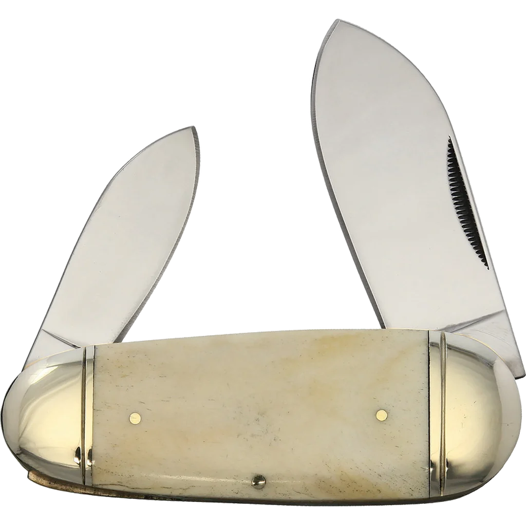 The Rough Ryder White Smooth Bone Baby Sunfish features mirror polished 440A stainless steel spear point blades with half stops and match strike pulls. The handles are white smooth bone with brass pins, brass liners, and nickel silver bolsters. It's 3.87" closed and weighs 6oz.