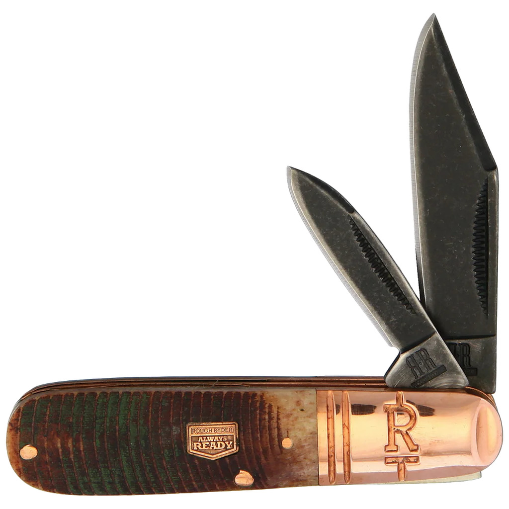 The Rough Ryder Barlow pocket knife is the quintessential tool for those who value reliability and ergonomic design in a cost-effective package. This slip joint knife, with its nail nick opener, harks back to a time-tested old school design, offering both comfort and efficiency in use. Its compact and sturdy build makes it a dependable choice for everyday carry, blending seamlessly with modern needs while retaining its classic charm. The folding knife features 440A stainless steel blades with a special Blackwash finish. The handles are amber sawcut bone with copper pins, liners, ringed bolsters, and shield. This Rough Ryder Backwoods Bushcrafter Barlow features a 2.75" clip point and 1.75" pen blade. It’s 3.37" closed and weighs 4oz.