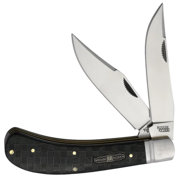 The NEW Rough Ryder Black Reserve Series is built and designed by collectors for collectors. Each knife has a sturdy robust construction made from the highest quality materials, a beautiful fit and finish, an eye catching presentation, and a custom display box. This series will find itself at home in any collection for decades to come! All the knives feature 440A stainless steel blades, black smooth bone or black basketweave Pakkawood handles, brass liners, G-10 underliners, nickel silver pins, and a special color-filled Black Reserve shield. This Black Reserve Saddlehorn Folder has 3" clip point and skinner blades. It's 4.25" closed and weighs 4.9oz.