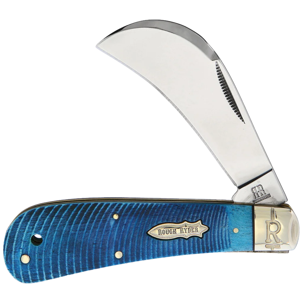 The Rough Ryder Black & Blue Series Hawkbill features a 3" mirror polished stainless steel Hawkbill blade with a half stop and a match strike pull. The handles are blue sawcut bone with nickel silver pins and brass liners, embossed nickel silver bolsters, and a nickel silver Rough Ryder shield. It’s 4" closed and weighs 7oz.