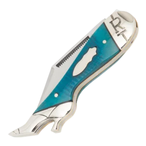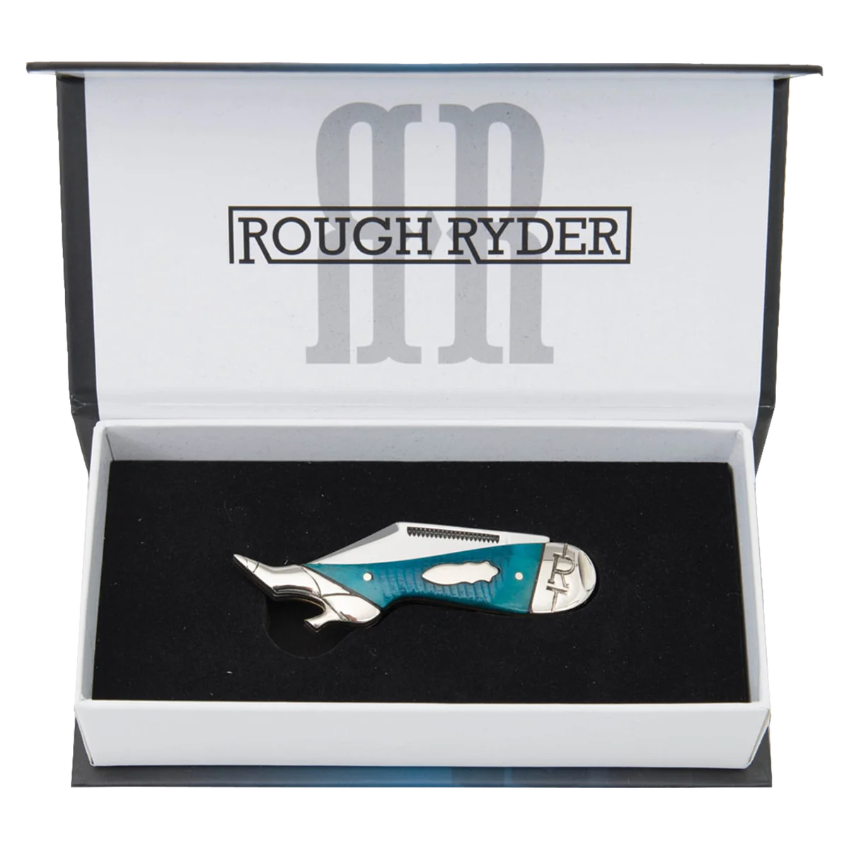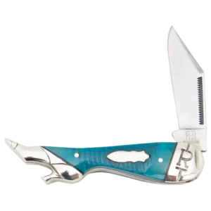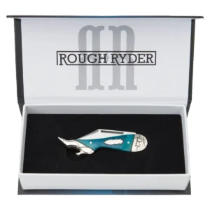 The Rough Ryder Black & Blue Jigged Bone Lady Leg Folding Knife is a unique and elegant addition to any pocket, designed for those who appreciate a touch of vintage charm in their everyday carry. Part of the Rough Ryder Black & Blue Series, this knife captures the essence of a classic design, reimagined with modern materials and craftsmanship, making it as functional as it is stylish. At the heart of this knife is its mirror-polished 440A stainless steel blade, known for its excellent balance of edge retention, corrosion resistance, and ease of sharpening. The blade features a half stop, adding an extra layer of safety by keeping the blade in place at the halfway point when opening or closing. The match strike pull allows for smooth and reliable opening, making this knife not only a conversation piece but also a dependable tool for everyday tasks. The handle of the Lady Leg knife is where it truly stands out. Crafted from blue sawcut bone, the handle is not only durable but also visually striking. The rich blue hue of the bone, combined with the textured sawcut pattern, provides a secure and comfortable grip, ensuring that the knife feels as good in hand as it looks. The black inner spacers add a subtle contrast, enhancing the overall aesthetic of the knife. Brass liners provide structural integrity, while nickel silver pins, a shield, and slant 'R' bolsters complete the look, giving the knife a classic, timeless appearance. Measuring 3.25 inches when closed and weighing a mere 1.44 ounces, the Rough Ryder Lady Leg Folding Knife is compact and lightweight, making it an ideal choice for those who prefer a smaller, more discreet carry option. Despite its delicate appearance, this knife is built to withstand the rigors of daily use, ensuring that it will serve you well whether you're using it to open packages, cut string, or simply admire its craftsmanship.