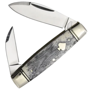 The Rough Ryder Black Appaloosa 30th Anniversary Spade Shield Senator Folding Knife is a celebration of three decades of Rough Ryder craftsmanship, bringing together classic design with refined details. This Senator-style knife is equipped with two versatile blades: a mirror-polished stainless steel spear point and a Wharncliffe blade. Both blades are designed for precision and durability, capable of handling a variety of cutting tasks with ease. The mirror-polished finish not only adds a sleek, reflective surface to the blades but also provides a layer of protection against corrosion, ensuring long-lasting sharpness. The match strike pull on each blade allows for smooth, effortless opening, making the knife ready for action at a moment's notice. The handles of the Black Appaloosa Senator Folding Knife are crafted from gray and white smooth bone, providing a striking contrast that exudes both elegance and ruggedness. The smooth bone handles are a nod to the traditional materials that have been used in knife-making for centuries, while the unique coloration sets this knife apart from the rest. The ringed nickel silver bolsters add a touch of sophistication, reinforcing the knife's structure and enhancing its visual appeal. A special feature of this anniversary edition is the spade-shaped nickel silver shield, which not only commemorates Rough Ryder's 30 years of excellence but also serves as a distinctive emblem of the brand's commitment to quality. The knife is further reinforced with brass liners and nickel silver pins, ensuring a sturdy and reliable construction that will stand the test of time. At 3.63 inches closed, the Black Appaloosa Senator is compact enough to fit comfortably in your pocket, yet substantial enough to handle daily tasks with confidence. Its lightweight design, combined with its elegant appearance, makes it an ideal companion for both everyday use and special occasions. Whether you're a collector looking for a unique piece to add to your collection or someone who appreciates the blend of tradition and modernity, this knife is sure to impress.