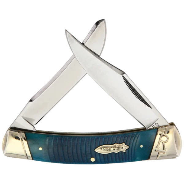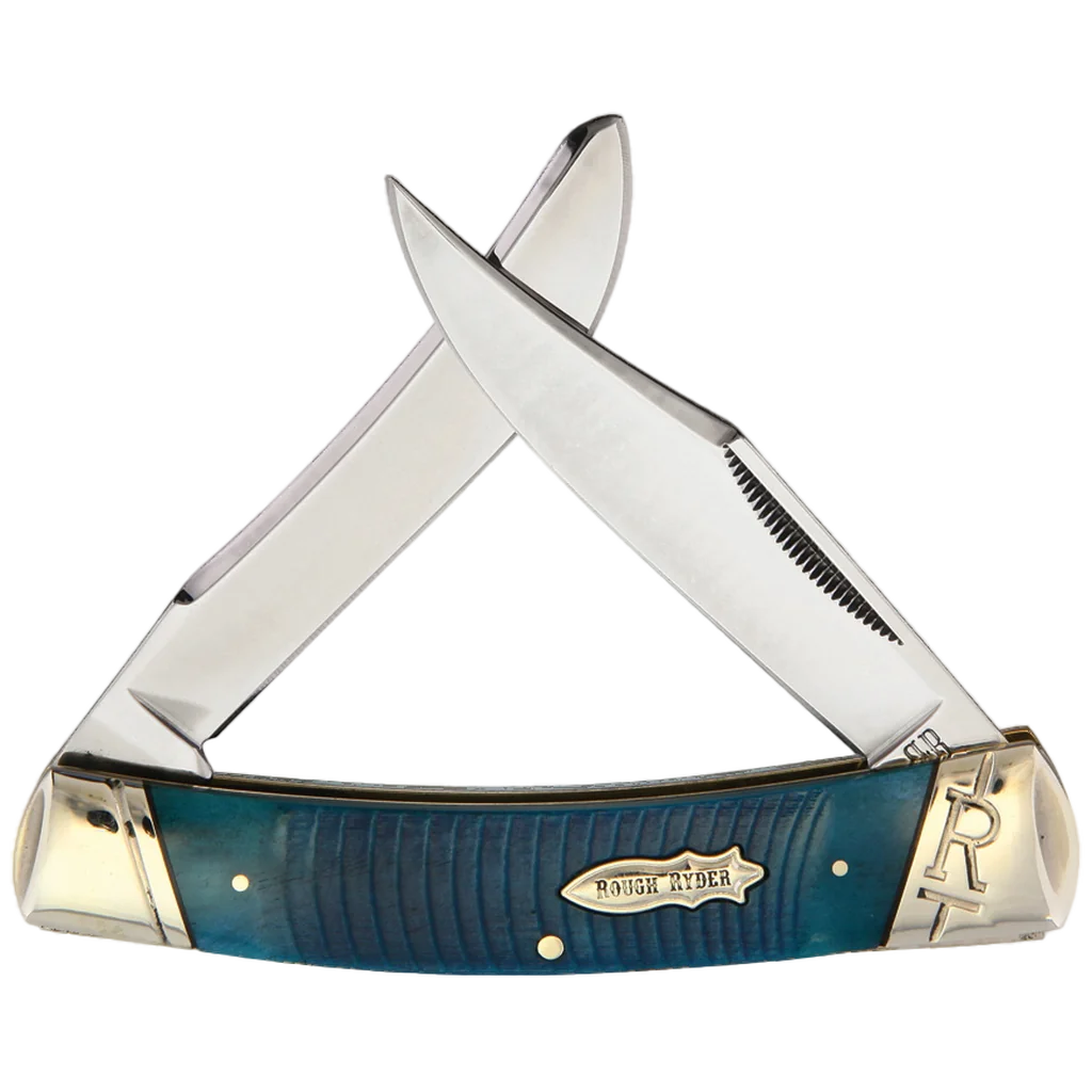 All the knives in the Rough Ryder Black & Blue Jigged Bone Series feature mirror polished 440A stainless steel blades with half stops and match strike pulls. The handles are blue sawcut jigged bone with black underliners, brass liners, nickel silver pins and embossed bolsters, and a nickel silver shield. This Rough Ryder Black & Blue Jigged Bone Moose has clip point and skinner blades. It's 4.37" closed and weighs 8oz.