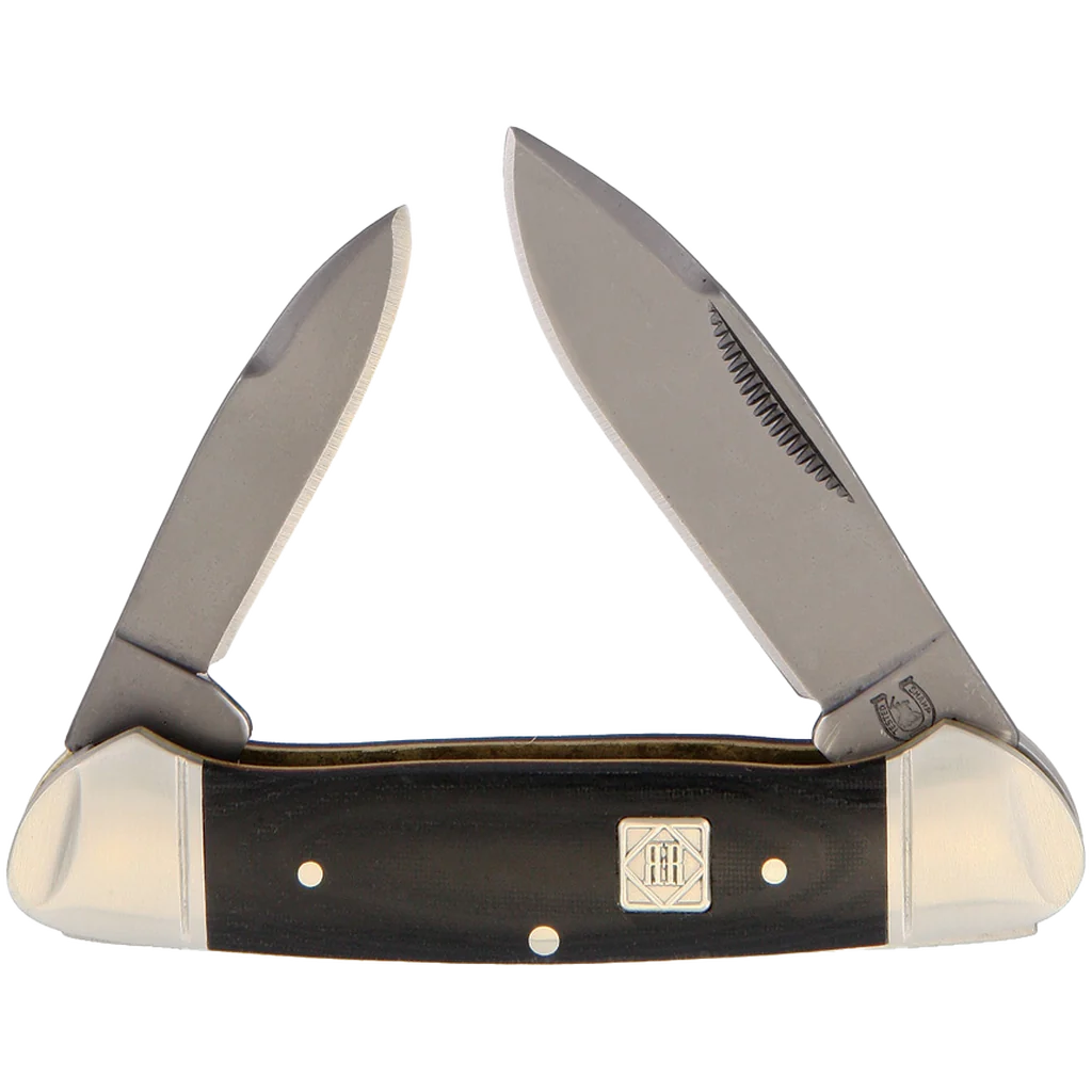 The Rough Ryder Black G-10 Canoe features 440 formula high-carbon steel titanium-coated 2.9" spear point and 1.97" pen blades with a match strike pull. The handles are black G-10 with brushed nickel silver pins and brass liners, ringed, pinched, brushed nickel silver bolsters, as well as a square, brushed, nickel silver Rough Ryder shield. It’s 3.625" closed and weighs 2.9 oz.