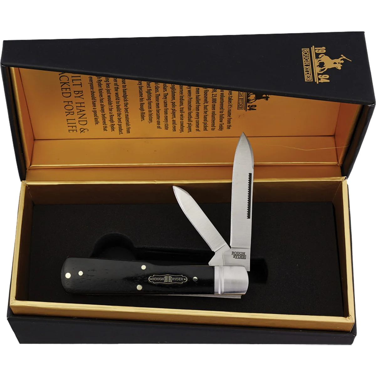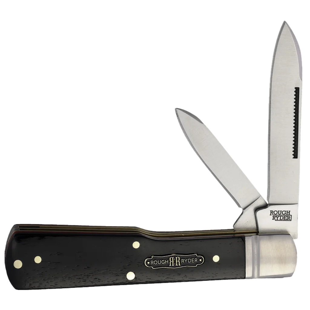 The NEW Rough Ryder Black Reserve Series is built and designed by collectors for collectors. Each knife has a sturdy robust construction made from the highest quality materials, a beautiful fit and finish, an eye catching presentation, and a custom display box. This series will find itself at home in any collection for decades to come! All the knives feature 440A stainless steel blades, black smooth bone or black basketweave Pakkawood handles, brass liners, G-10 underliners, nickel silver pins, and a special color-filled Black Reserve shield. This Rough Ryder Black Reserve Gunstock has black smooth bone handles. It's 3.75" closed and weighs 3.7oz.