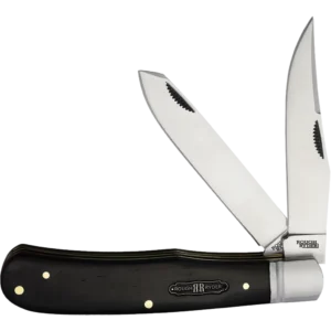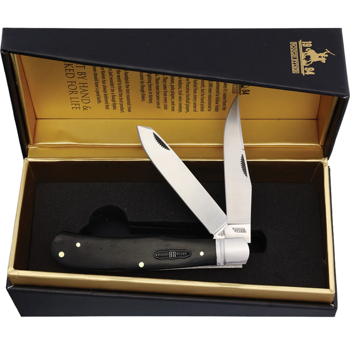 The NEW Rough Ryder Black Reserve Series is built and designed by collectors for collectors. Each knife has a sturdy robust construction made from the highest quality materials, a beautiful fit and finish, an eye catching presentation, and a custom display box. This series will find itself at home in any collection for decades to come! All the knives feature 440A stainless steel blades, black smooth bone or black basketweave Pakkawood handles, brass liners, G-10 underliners, nickel silver pins, and a special color-filled Black Reserve shield. This Black Reserve Trapper has 2.87" clip point and spey blades. It's 4.12" closed and weighs 4.2oz.