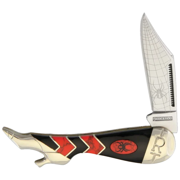 The “Black Widow” Lady Leg has a single mirror polished 440A stainless steel clip point blade. The blade has a detailed spiderweb and black widow spider etch. The pinched bolsters also feature a slant R design. The blade opens with a match strike pull. Unlike a standard nail nick or long pull, a match strike pull has serrations inside the groove of the pull. These serrations allow you to strike a match with your knife. The blade uses the half stops and slip joints found in traditional pocket knives.