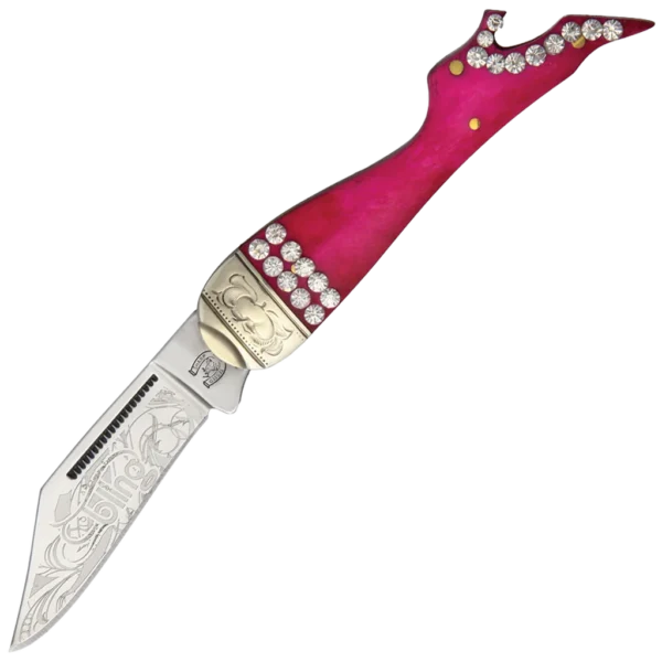 3 1/4″ closed. 2 1/8″ 440 stainless clip blade with "bling" and scroll blade etching. Pink smooth bones handles with crystal accents. Grooved and pinched nickel silver bolster with scroll engraving.