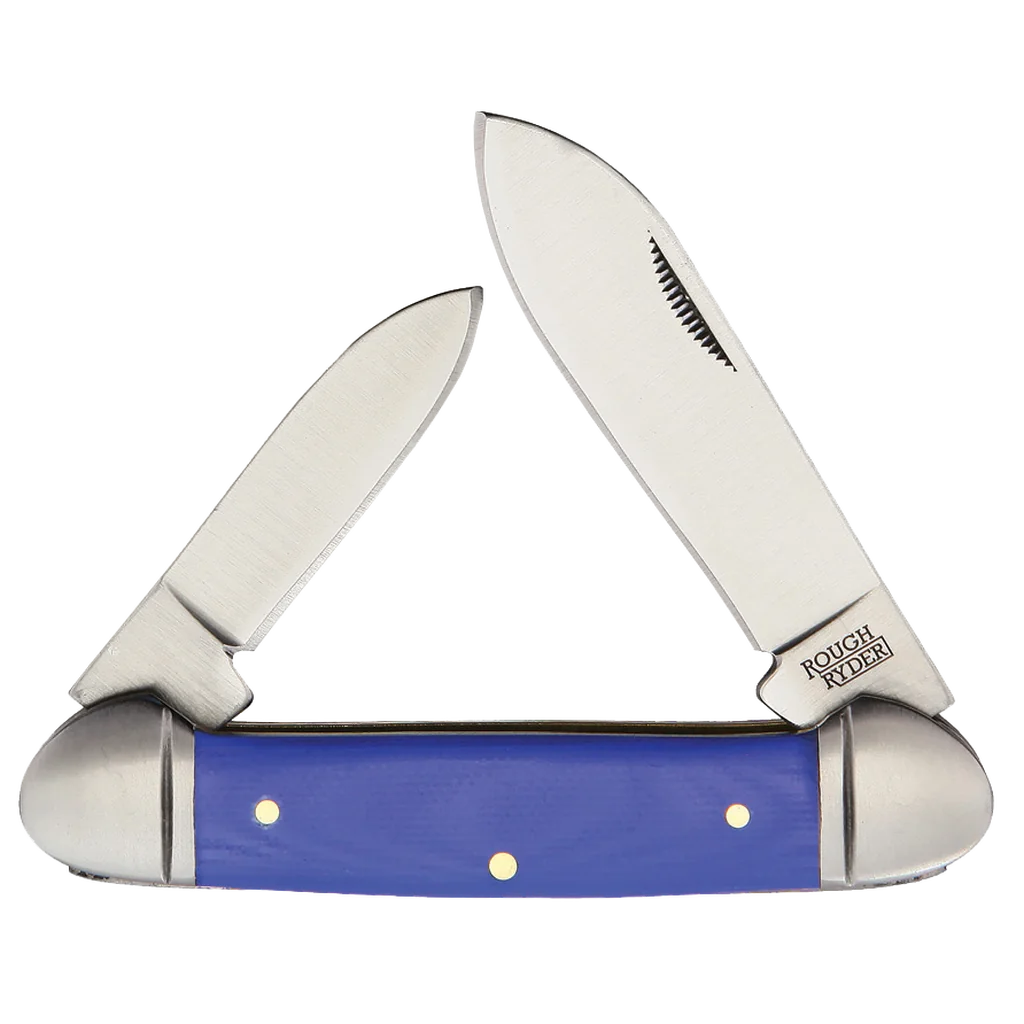 All the knives in the Rough Ryder Blue Mule Series feature 440A stainless steel blades with half stops and match strike pulls and satin finish. The handles are blue G-10 with steel pins and brass liners, as well as brushed bolsters. This Rough Ryder Blue Mule Canoe features a 2.625" Spear Point blade and a smaller 2" Pen blade. When closed it measures 3.625".
