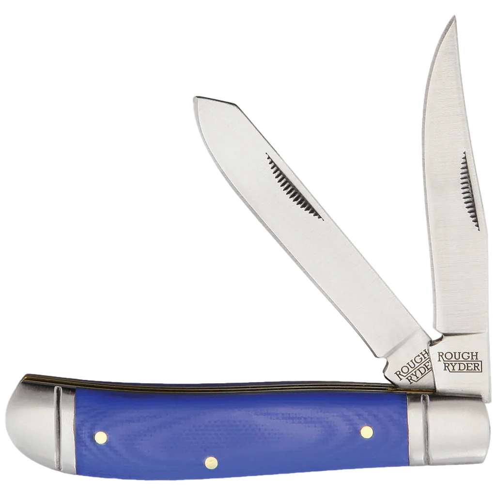 The knives in the Rough Ryder Blue Mule Series combine the timeless profile of a traditional pocket knife with the sleek lines and surefire grip of a modern folder. Each has 440A stainless steel blades with match strike pulls and a satin finish. The handles are smooth blue G-10 with brass liners, stainless steel pins, and brushed stainless steel bolsters. This Rough Ryder Blue Mule Mini Trapper has 2.75" clip point and spey blades. It’s 3.5" closed and weighs 2.82oz.