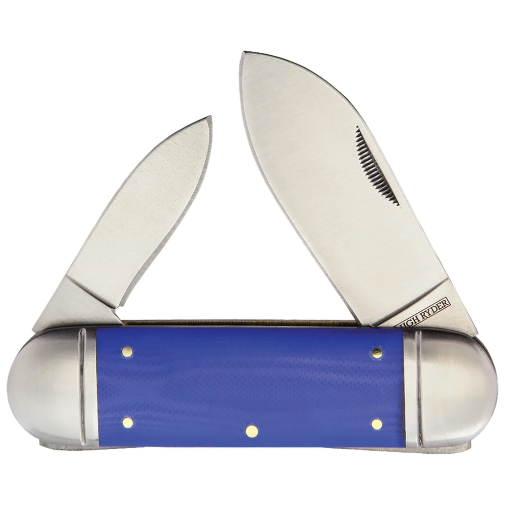 The knives in the Rough Ryder Blue Mule Series combine the timeless profile of a traditional pocket knife with the sleek lines and surefire grip of a modern folder. Each has 440A stainless steel blades with match strike pulls and a satin finish. The handles are smooth blue G-10 with brass liners, stainless steel pins, and brushed stainless steel bolsters. This Rough Ryder Blue Mule Sunfish has two spear point blades. It's 4.25" closed and weighs 3.92oz.