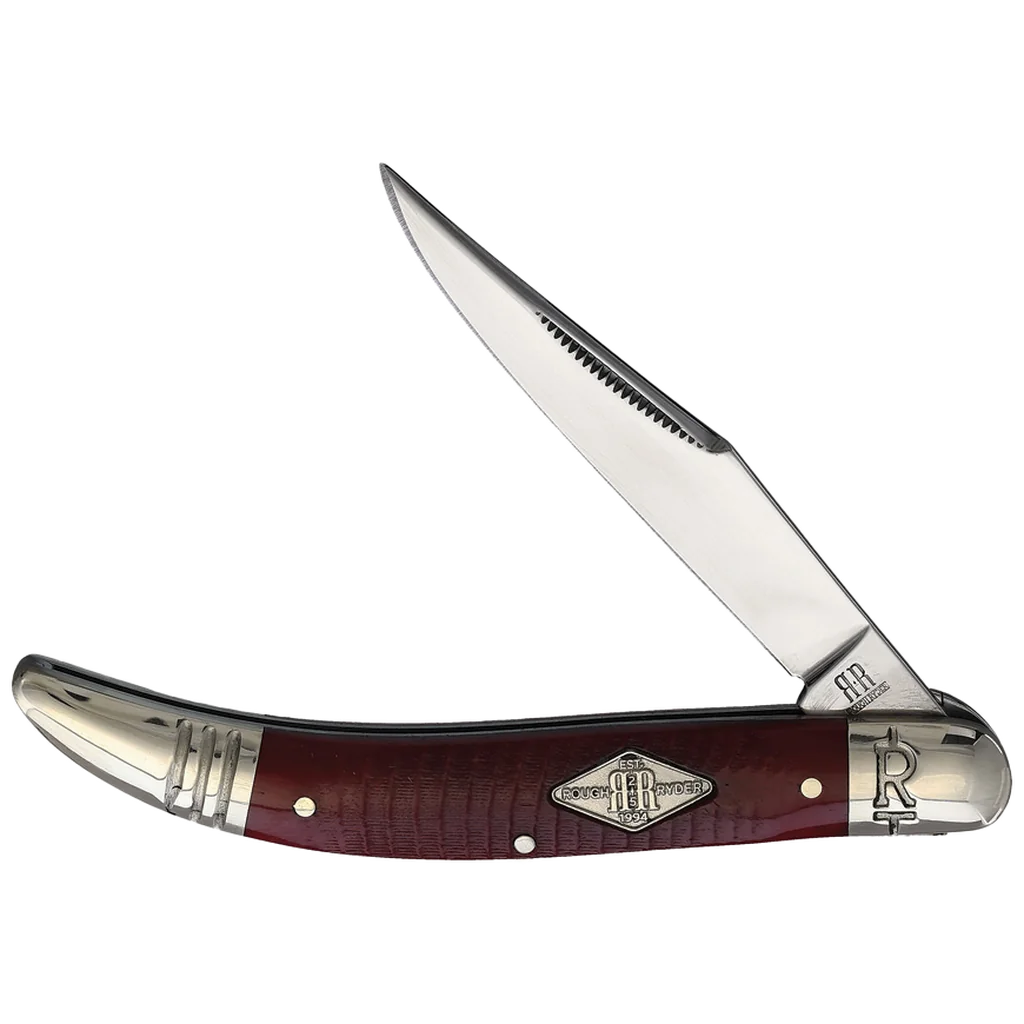 The Rough Ryder Bolster Lock Red Jigged Bone Toothpick features a 2.75" mirror polished 440A stainless steel clip point blade with a match strike pull. The handles are red jigged bone with brass pins and liners, nickel silver bolsters, and a sturdy bolster lock. It's 4" closed and weighs 1oz.