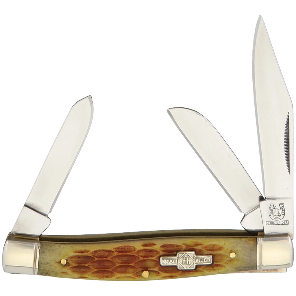 This knife features amber jigged bone handles, nickle silver bolsters and shield, brass liner and pins, with three of Rough Ryder's famous 440A stainless steel blades (clip, spey & sheepsfoot). The closed length is 3.25". These knives are of the highest quality with a great fit and finish.