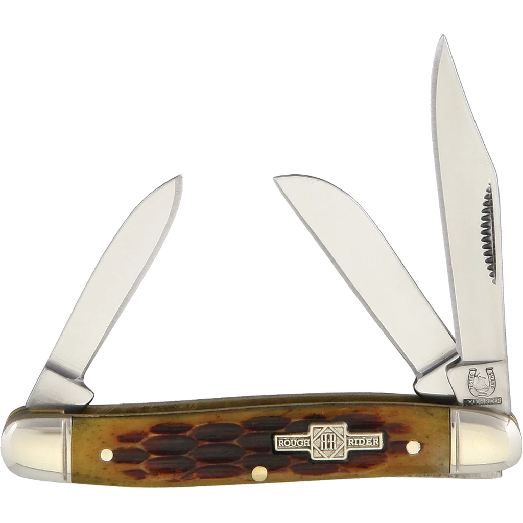 All the knives in the Rough Ryder Brown Jigged Bone Series feature mirror polished blades with nail nicks and half stops. The handles are brown jigged bone with brass pins and liners, nickel silver bolsters, and a nickel silver Rough Ryder shield. This Rough Ryder Brown Jigged Bone Mini Stockman has clip point, Sheepsfoot, and pen blades. It's 2.75" closed and weighs 1.28oz.