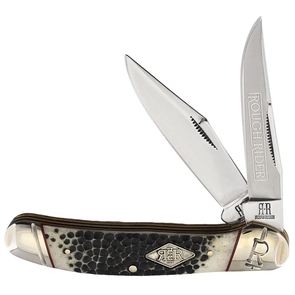 This Copperhead knife features two mirror-polished 440A stainless steel blades – a clip point and a skinner – etched with a Rough Ryder logo in reverse frost for an added touch of class. These blades are designed to handle a range of tasks with precision, whether you’re using them for everyday chores or more specialized cutting needs. The handle is crafted from buckshot bone, a material known for its distinctive, rugged appearance and excellent durability. This handle material is complemented by nickel silver pins, which secure the handle components together, and brass liners that add to the knife’s structural integrity. The red underliners provide a vibrant contrast to the buckshot bone, enhancing the knife’s visual appeal. The embossed nickel silver bolsters add a touch of elegance and reinforce the knife’s durability, while the diamond-shaped nickel silver Rough Ryder shield offers a nod to the brand’s commitment to quality.