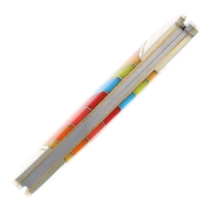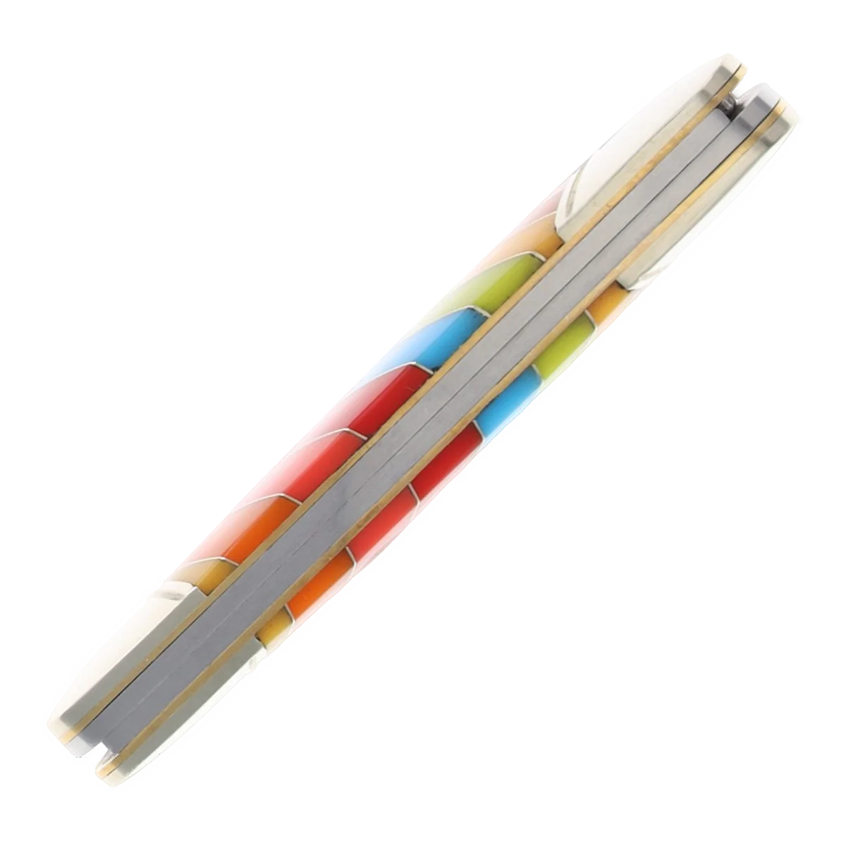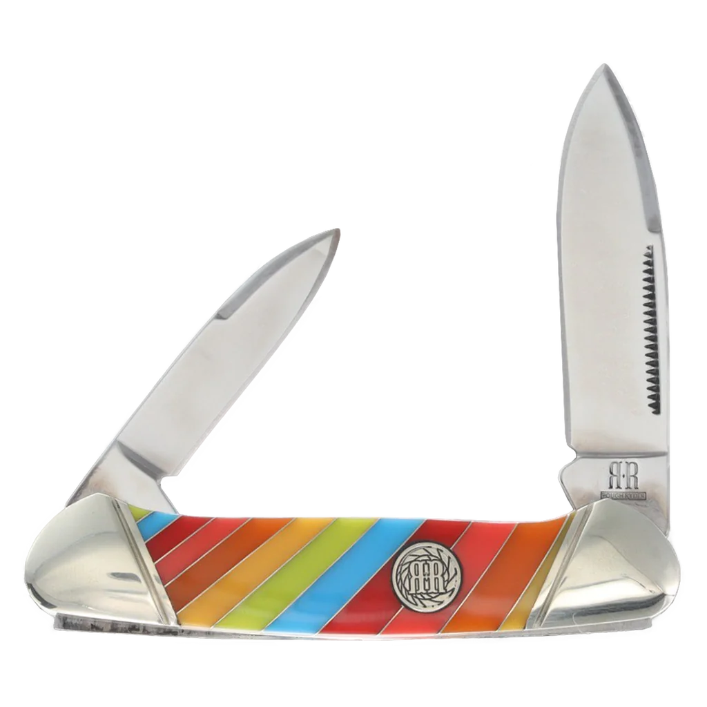 All of the knives in the Rough Ryder Lollipop Series feature mirror polished stainless steel blades with nail nick pulls. The handles are a vibrant multicolored striped synthetic material with nickel silver spacers and bolsters, brass liners, and a nickel silver Rough Ryder shield. Lollipop Series. 3.63" (9.22cm) closed. Mirror finish stainless spear and pen blades. Multi plastic handle. Nickel silver bolster(s). Inlay shield. Boxed.