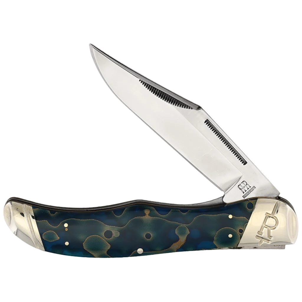 All the knives in the Rough Ryder Celestial Series feature mirror polished 440A stainless steel blades with nail nick pulls. The handles are blue and green celestial swirled acrylic with nickel silver pins, brass liners, and embossed nickel silver bolsters. This Rough Ryder Celestial Large Folding Hunter has a 3.5" clip point blade, that is secured with a liner lock. It's 5" closed and weighs 5.68oz.