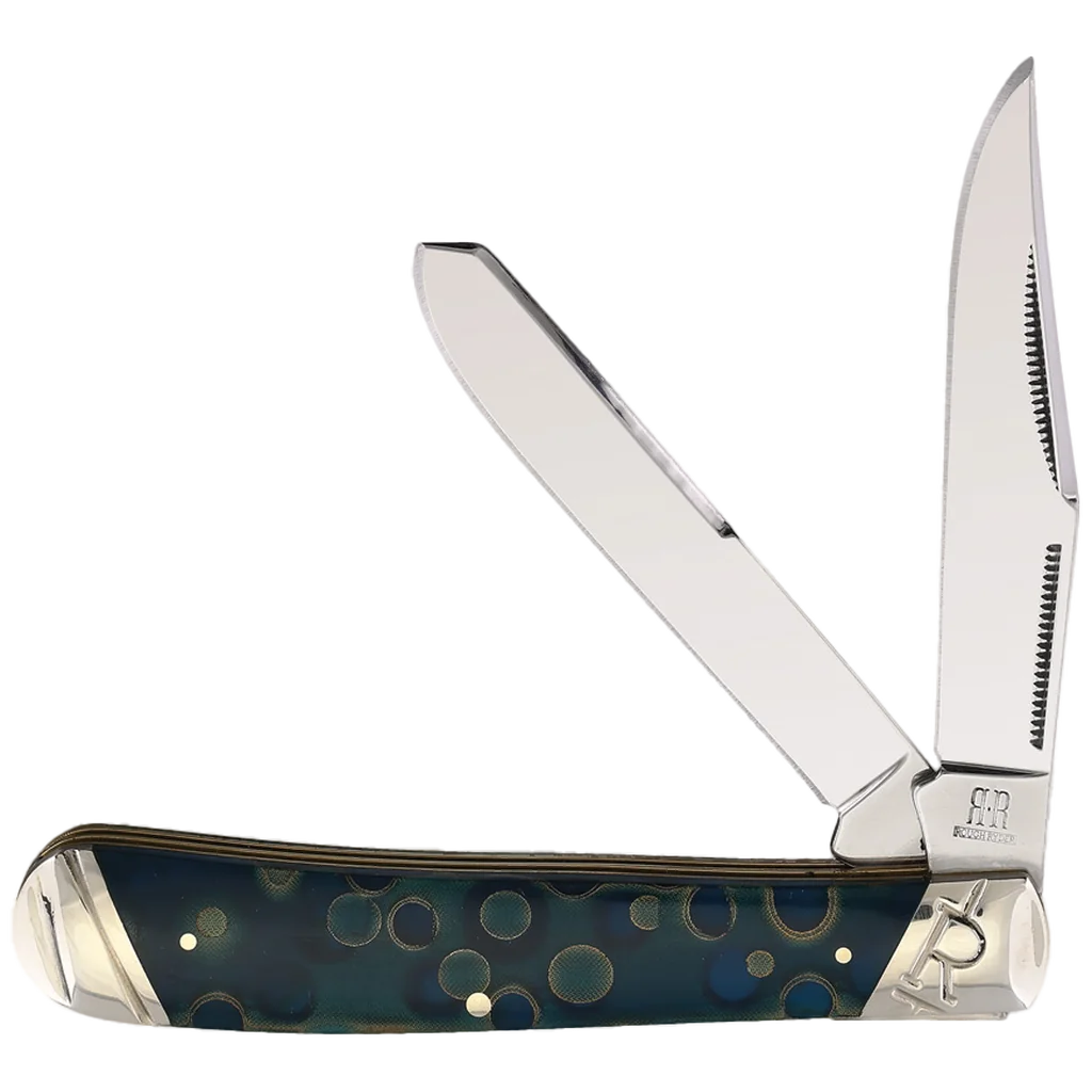 All the knives in the Rough Ryder Celestial Series feature mirror polished 440A stainless steel blades with nail nick pulls. The handles are blue and green celestial swirled acrylic with nickel silver pins, brass liners, and embossed nickel silver bolsters. This Celestial Trapper features a non locking 3.27" clip point and 3.25" spey blade. It's 4.12" closed and weighs 4oz.