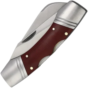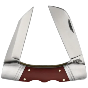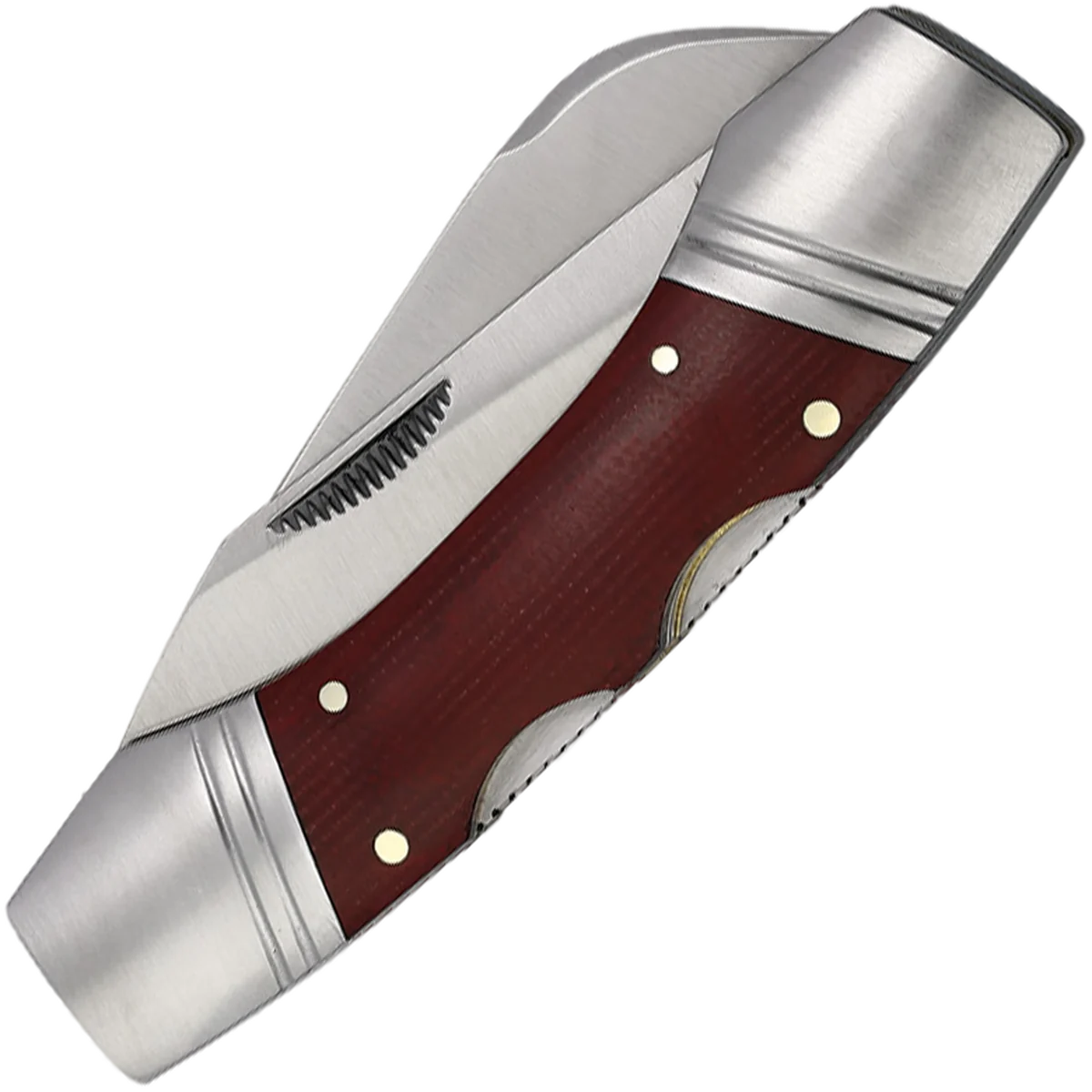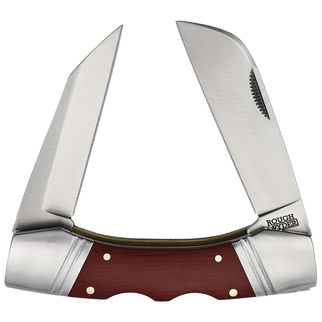 Introducing the Rough Ryder Lockhorn Double Lockback, a folding knife designed for those who demand both style and substance. Built with precision and ruggedness, this knife is crafted to handle the toughest tasks while showcasing exceptional craftsmanship. The Rough Ryder Lockhorn Double Lockback features blades made from 440C stainless steel, known for its high hardness and excellent edge retention. The smooth satin finish on the blades gives a refined appearance, while the match strike pull ensures easy and reliable access. Each blade locks independently with sturdy stainless steel back locks, providing secure operation and added safety during use. The handles are made from warm Chili Micarta, offering both durability and a comfortable grip. Micarta is highly resistant to moisture and environmental stress, making it an ideal material for handles. The handles are complemented by ringed nickel silver bolsters and brass pins and liners, which add a touch of elegance and further enhance the knife's durability. Measuring 3.88 inches when closed, the Rough Ryder Lockhorn Double Lockback is compact enough for everyday carry while being robust enough for various cutting tasks. It comes with a brown and black patterned nylon sheath, providing secure storage and easy access when you're on the go.