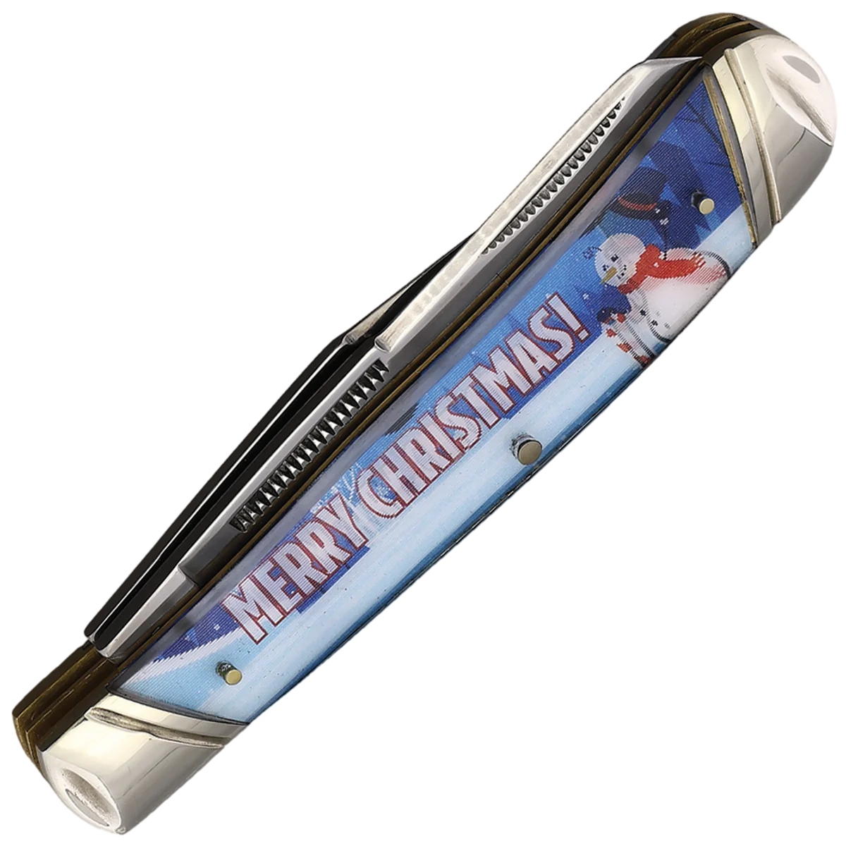 The Rough Ryder 2023 Merry Christmas Trapper features 3.12" 440A stainless steel clip point and spey blades with match strike pulls, half stops, and reverse frosted "Merry Christmas!" and "Rough Ryder" blade etches. The handles are full color acrylic animated lenticular with nickel silver pins, nickel silver slant R bolsters, and brass liners. It's 4.12" closed and weighs 4oz.