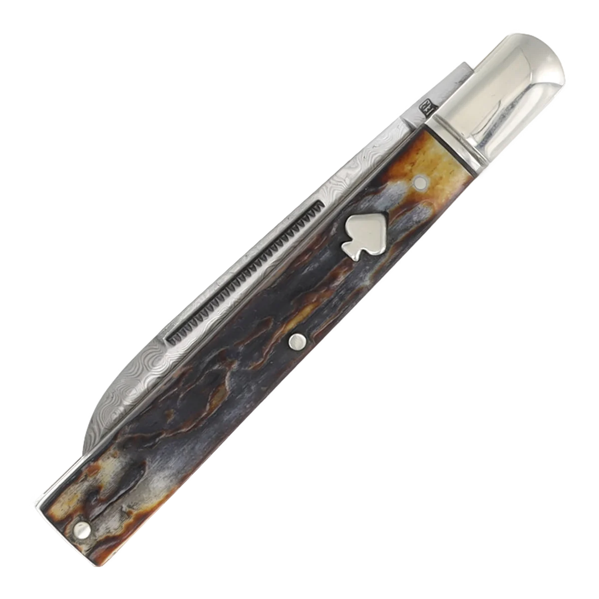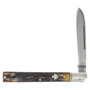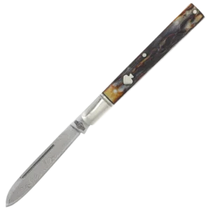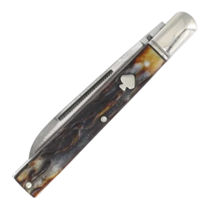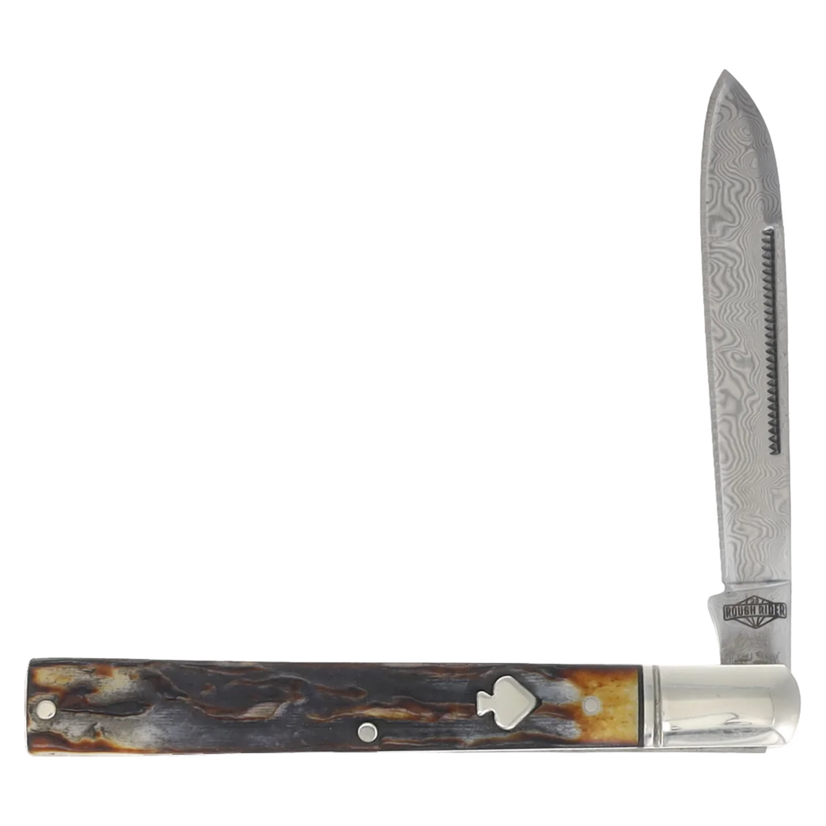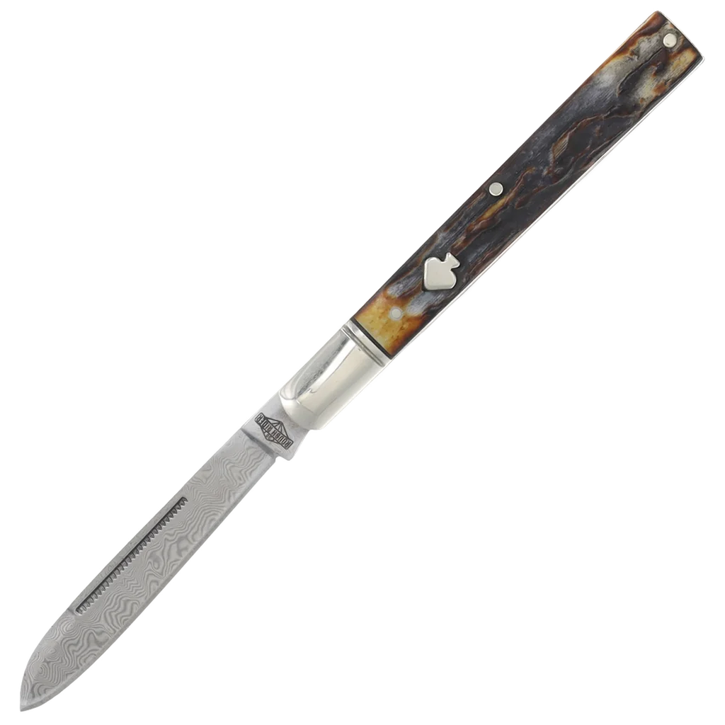 Step back in time to an era when the traveling doctor was a symbol of healing and hope, armed not just with medical knowledge, but also with a trusty companion: the Rough Ryder Cinnamon Bone Damascus Doctor's Knife. This exquisite piece of cutlery pays homage to a bygone era when these versatile pocket knives were an essential tool in the doctor’s bag, accompanying physicians on their rounds and aiding them in a myriad of medical tasks. At the heart of this distinguished knife lies a Damascus spear point blade, its surface adorned with mesmerizing layers of steel that create a unique and intricate pattern. The handles of the Rough Ryder Cinnamon Bone Damascus Doctor's Knife are crafted from cinnamon jigged bone, a material that evokes warmth and familiarity. Brass pins and liners add strength and stability, ensuring that this knife is not only beautiful but also built to last. Ringed nickel silver bolsters provide an elegant contrast to the rich tones of the bone, while a special spade-shaped shield made of nickel silver serves as a mark of distinction and quality.