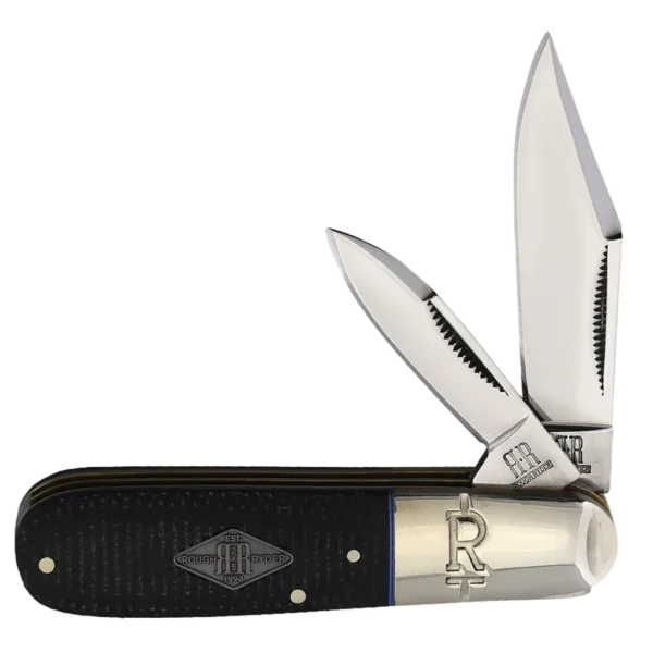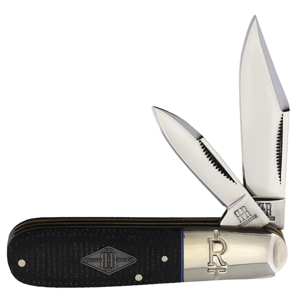 All the knives in the Rough Ryder Classic Carbon II Series feature mirror polished T10 carbon steel blades with half stops and nail nick openers. The handles are black Micarta with nickel silver pins, brass liners, blue underliners, embossed nickel silver bolsters, and a diamond-shaped pewter Rough Ryder shield. This Rough Ryder Classic Carbon II Barlow features a 2.37" clip point and a 1.62" pen blade.