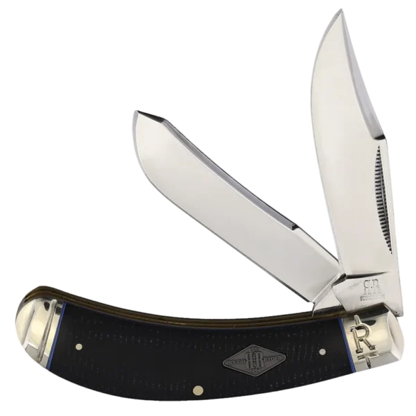 All the knives in the Rough Ryder Classic Carbon II Series feature mirror polished T10 carbon steel blades with match strike pulls. The handles are black Micarta with blue underliners, brass liners, nickel silver pins, and embossed nickel silver Slant R bolsters. This Rough Ryder Classic Carbon II Bow Trapper has clip point and skinner blades. It's 4" closed and weighs 4oz.