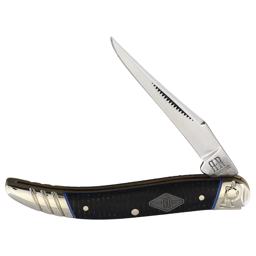 All the knives in the Rough Ryder Classic Carbon II Series feature mirror polished T10 carbon steel blades with match strike pulls. The handles are black Micarta with blue underliners, brass liners, nickel silver pins, and embossed nickel silver Slant R bolsters. This Rough Ryder Classic Carbon II Small Toothpick has a 2.25" clip point blade. It's 3" closed and weighs an ounce.