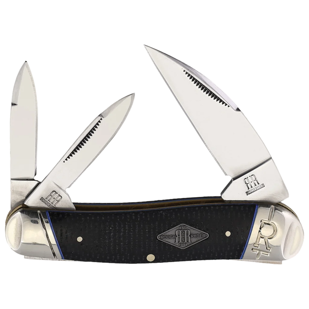 Introducing the Rough Ryder Classic Carbon II Swayback, a refined yet robust pocket knife crafted for durability and style. Part of the esteemed Classic Carbon II Series, this knife boasts mirror-polished T10 carbon steel blades, known for their exceptional edge retention and strength. The Wharncliffe and pen blades, equipped with match strike pulls, offer versatility and precision for a range of cutting tasks. The handles are made from sleek black Micarta, paired with striking blue underliners, creating a modern and stylish appearance. This combination not only enhances the visual appeal but also provides a comfortable and secure grip. The brass liners add structural integrity, ensuring the knife's durability, while the nickel silver pins and embossed Slant R bolsters provide a touch of classic elegance. The diamond-shaped pewter shield on the handle signifies the knife's quality and craftsmanship. Measuring 3.75 inches closed and weighing 3.32 ounces, the Classic Carbon II Swayback is compact and portable, making it an ideal everyday carry.