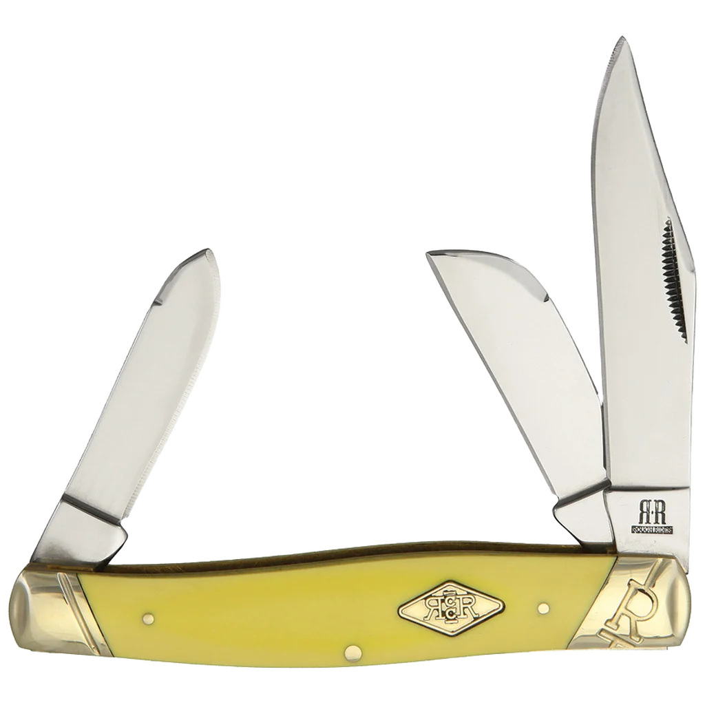Part of the esteemed Classic Carbon Series, this knife features three blades made from mirror-polished T10 carbon steel – Clip point, Spey and Sheepsfoot. Renowned for its exceptional edge retention and durability, T10 carbon steel ensures reliable performance for a variety of cutting tasks. The blade includes nail nick pulls, adding a touch of classic charm and practicality. The handle is made from smooth yellow composition, providing a comfortable grip and a striking contrast to the polished blade. Accentuated with brass pins and liners, the handle is both sturdy and visually appealing. The embossed nickel silver Slant R bolsters add a touch of elegance, while the diamond-shaped nickel silver Rough Ryder Classic Carbon shield signifies quality craftsmanship.