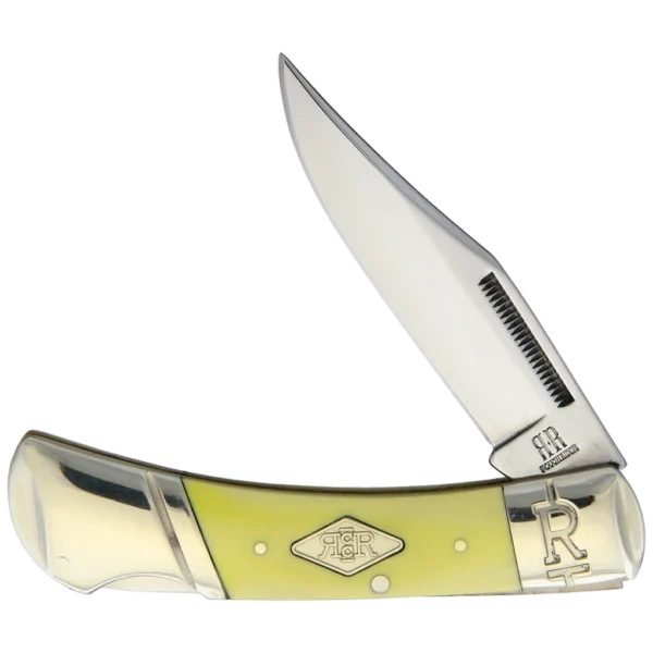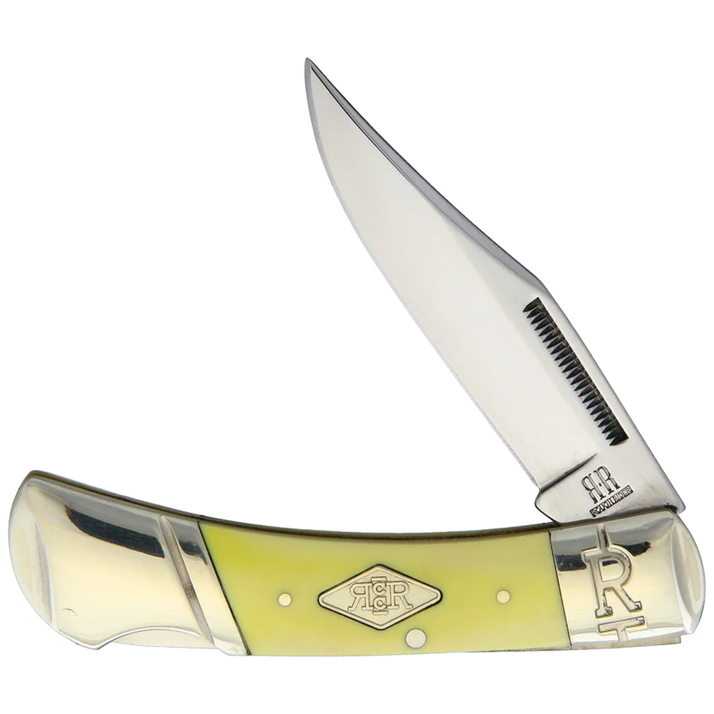 Introducing the Rough Ryder Classic Carbon Lockback, a meticulously crafted pocket knife that combines traditional design with modern functionality. Part of the esteemed Classic Carbon Series, this knife features a 3-inch clip point blade made from mirror-polished T10 carbon steel. Renowned for its exceptional edge retention and durability, T10 carbon steel ensures reliable performance for a variety of cutting tasks. The blade includes nail nick pulls, adding a touch of classic charm and practicality. The handle is made from smooth yellow composition, providing a comfortable grip and a striking contrast to the polished blade. Accentuated with brass pins and liners, the handle is both sturdy and visually appealing. The embossed nickel silver Slant R bolsters add a touch of elegance, while the diamond-shaped nickel silver Rough Ryder Classic Carbon shield signifies quality craftsmanship. The knife's lockback mechanism ensures a secure and sturdy lockup, offering safety and confidence during use.