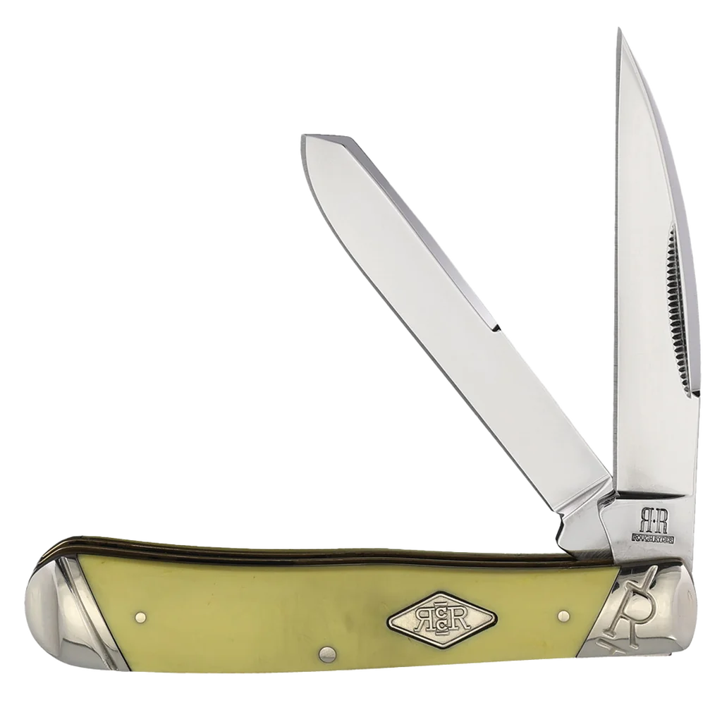 All the knives in the Rough Ryder Classic Carbon series feature T10 carbon steel blades with half stops and match strike pulls and mirror-polished finish. The handles are yellow composition with brass pins liners, nickel silver ringed, pinched and stamped bolsters, and a nickel silver diamond-shaped shield with the initials "RR" and "CC". This Rough Ryder Classic Carbon Wharncliffe Trapper features 3.125" Wharncliffe and spey blades. It’s 4.125" closed and weighs 4 oz.