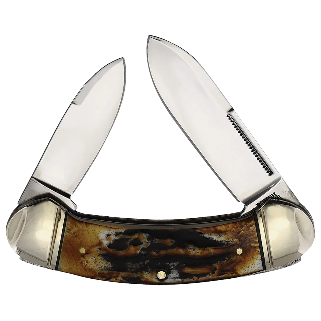 All the knives in the Rough Ryder Classic Cinnamon Bone Stag Series feature mirror polished carbon steel blades with nail nicks and half stops. The handles are cinnamon bone stag with brass and black synthetic liners, nickel silver pins, and nickel silver bolsters. This Rough Ryder Classic Cinnamon Bone Stag Bow Canoe features spear point and pen blades. It's 3.5" closed and weighs 3.56oz.