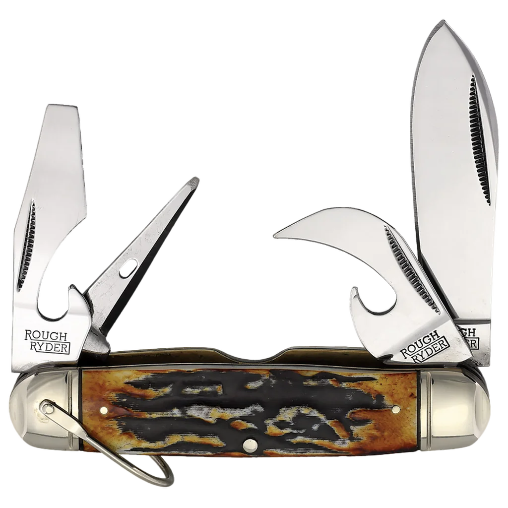 All the knives in the Rough Ryder Classic Cinnamon Bone Stag Series feature mirror polished carbon steel blades with nail nick pulls. The handles are cinnamon bone stag with brass and black synthetic liners, nickel silver pins, and nickel silver bolsters. This Rough Ryder Classic Cinnamon Bone Stag Kamp King has a spear point blade, a can opener, a bottle opener with screwdriver tip, and an awl. It's 3.63" closed and weighs 6.3oz.