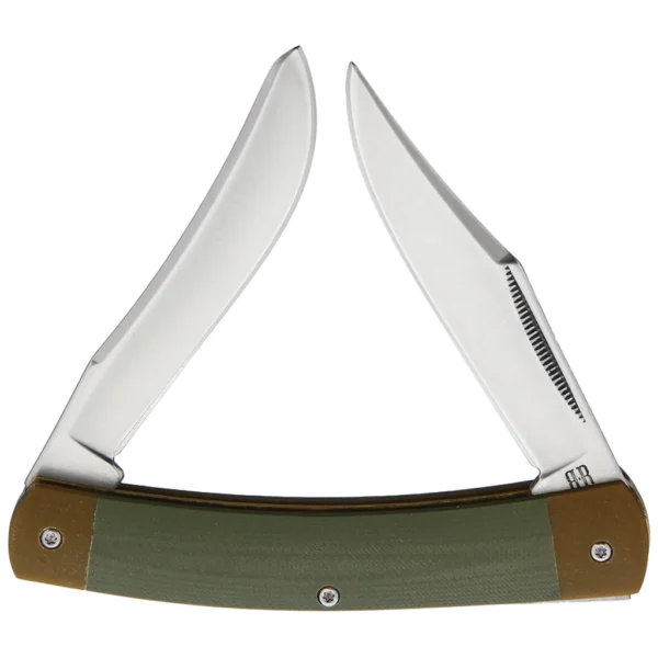 All the knives in the Rough Ryder Classic G-10 Series feature 440A stainless steel blades with match strike pulls and a smooth satin finish. The handles are grippy green G-10 with Desert Tan G-10 bolsters, brass liners, and stainless steel Torx hardware. This Rough Ryder Classic G-10 Moose has 3" clip point and spey blades. It's 4.37" closed and weighs 3.5oz.
