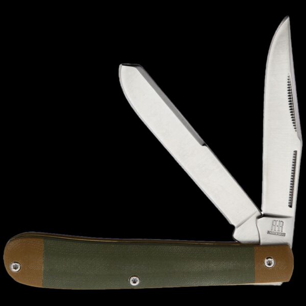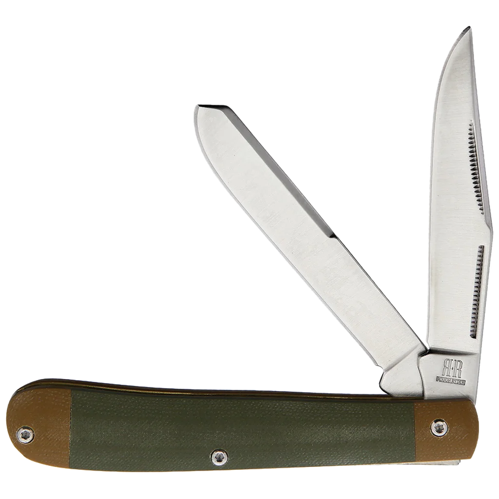 All the knives in the Rough Ryder Classic G-10 Series feature 440A stainless steel blades with match strike pulls and a smooth satin finish. The handles are grippy green G-10 with Desert Tan G-10 bolsters, brass liners, and stainless steel Torx hardware. This Rough Ryder Classic G-10 Moose has a 3.27" clip point and 3.25" spey blade. It's 4.125" closed.