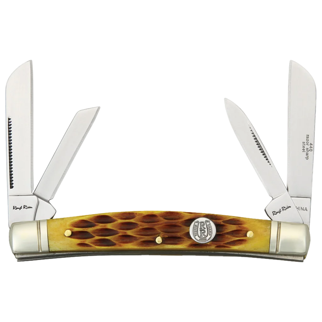 All the knives in the Rough Ryder Brown Jigged Bone Series feature 440A stainless steel blades with nail nick pulls and a mirror-polished finish. The handle is made from Amber Bone. This is cow bone that is enhanced with a texture and then coloured. This material has been used for over 100 years for knife handles. Brass pins and liners, ringed nickel silver bolsters, and a nickel silver RR shield complete the folding knife. The Congress folding knife features four blades: twin sheepsfoot, pen, and coping blades.