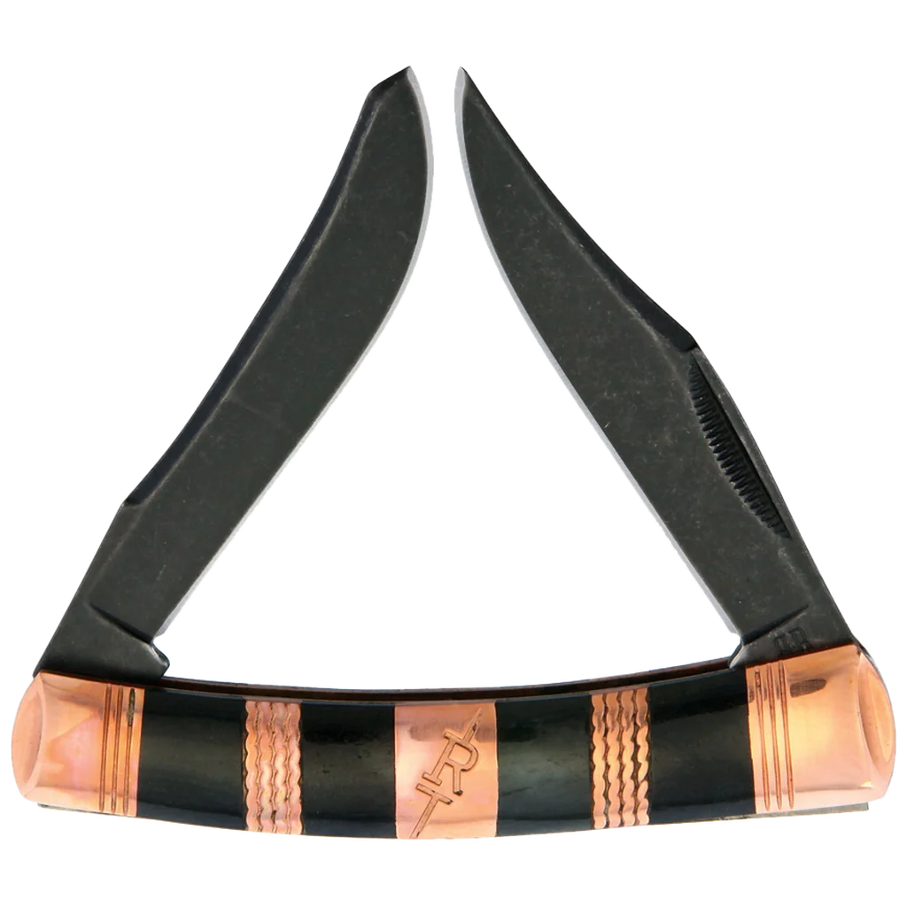 All the knives in the Rough Ryder Copper Coil Series feature 440A stainless steel blades with match strike pulls and a blackwash finish. The handles are black smooth bone and copper coil with a Slant R center bolster, copper liners, and pinched copper bolsters. This Rough Ryder Copper Coil Large Moose has clip point and skinner blades. It's 4.37" closed.