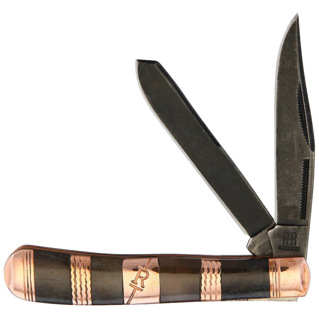 All the knives in the Rough Ryder Copper Coil Series feature 440A stainless steel blades with a blackwash finish and match strike pulls. The handles are black smooth bone and copper choil with a Slant R center bolster, copper liners, and pinched copper bolsters. The Copper Coil trapper features 3.12" clip point and spey blades.