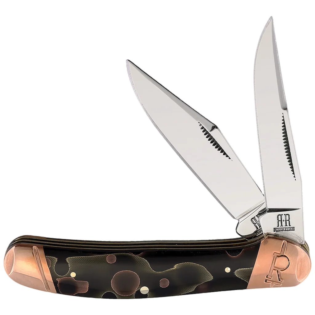 The Rough Ryder Copper Swirl Copperhead features mirror polished 440A stainless steel clip point and skinner blades with match strike pulls. The handles are black acrylic with a cool copper swirl, copper bolsters, nickel silver pins, and brass liners. It's 3.75" closed and weighs 3.04oz.