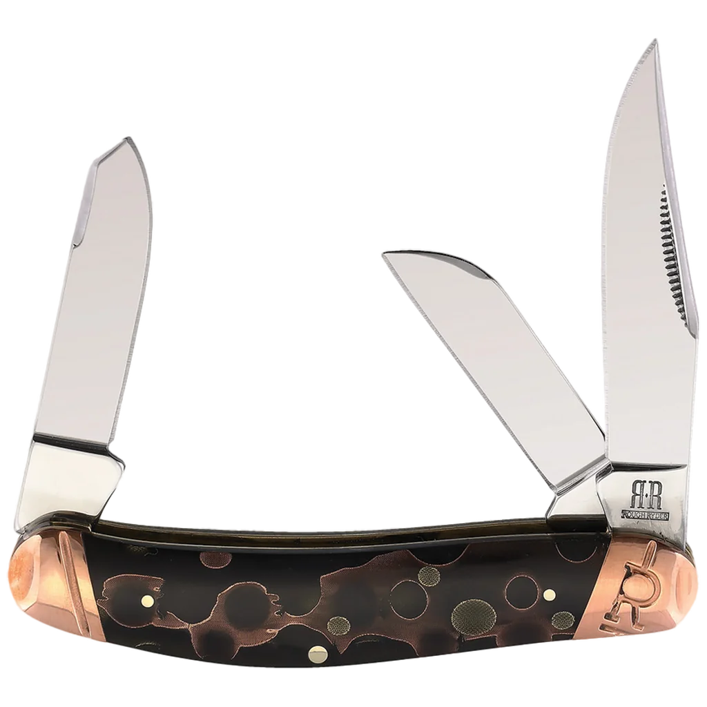 All the knives in the Rough Ryder Copper Swirl Series feature mirror polished 440A stainless steel blades with match strike pulls. The handles are copper-swirled black acrylic with nickel silver pins, brass liners, and embossed copper bolsters. This Rough Ryder Copper Swirl Sowbelly features clip point, Sheepsfoot, and spey blades. It’s 3.37" closed and weighs 3.7oz.