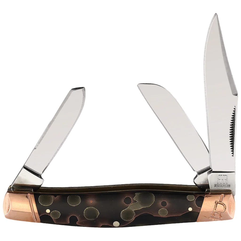 All the knives in the Rough Ryder Copper Swirl Series feature 440A stainless steel blades with match strike pulls and mirror polished finish. The handles are copper swirled black acrylic with nickel silver pins, brass liners, and embossed copper bolsters. This Rough Ryder Copper Swirl Stockman features clip point, Sheepsfoot, and spey blades. It's 3.75" closed and weighs 3.84oz.