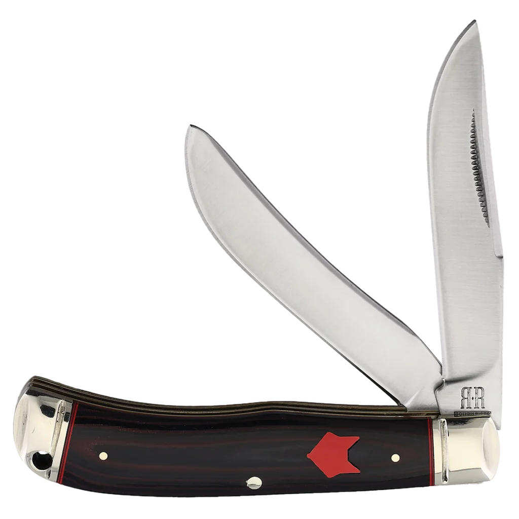 All the knives in the Rough Ryder Red Fox Series feature 440 stainless steel blades with nail nick pulls and a satin finish. The handles are warm black and red Micarta with a Red Fox Micarta shield, nickel silver pins and bolsters, brass liners, and red synthetic spacers.