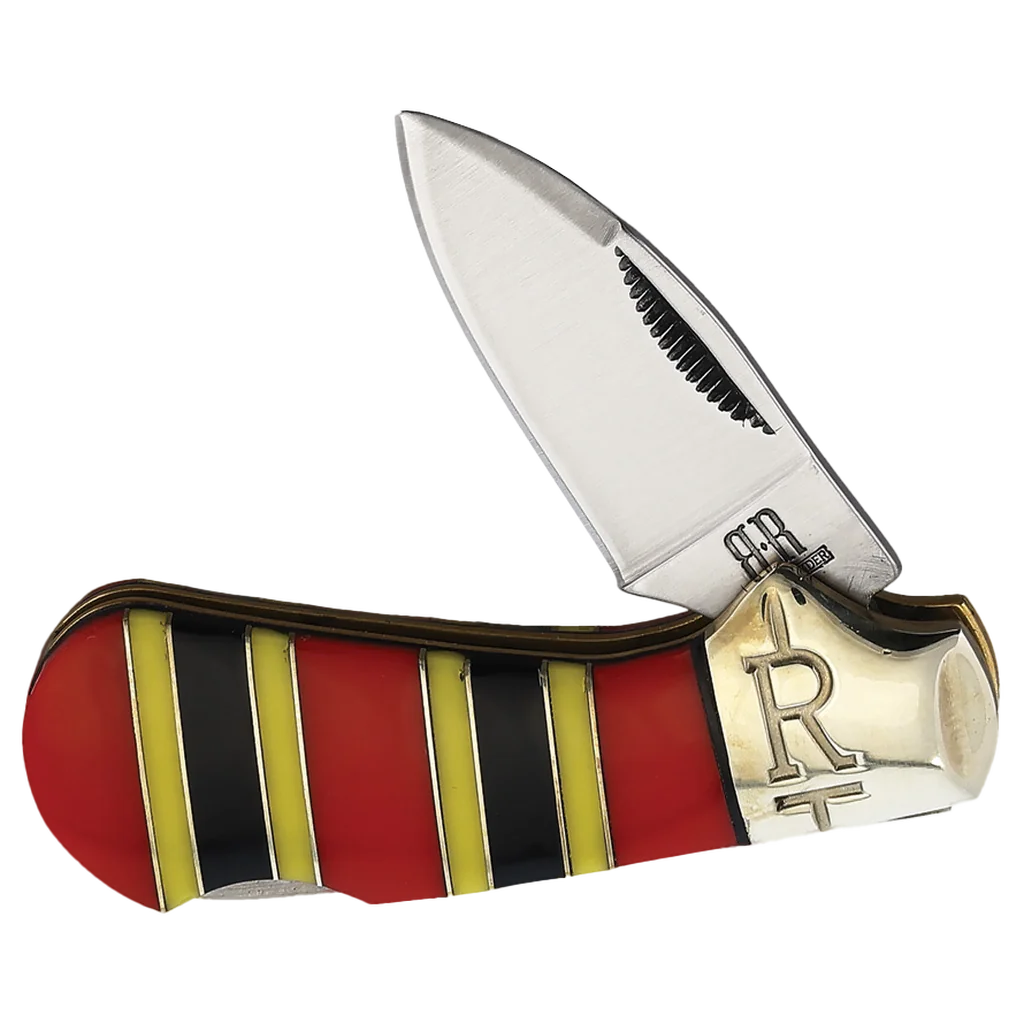 All the knives in the Rough Ryder Coral Snake Series feature mirror polished 440A stainless steel blades with match strike pulls. The handles are as eye-catching as they are functional. Made from red, black, and yellow coral snake synthetic material, the handle mimics the distinctive and vibrant pattern of the coral snake, making this knife a standout piece. The handle is further complemented by nickel silver spacers and bolsters, adding to its durability and elegance. The combination of these elements not only provides a visually appealing contrast but also ensures a comfortable and secure grip. This Rough Ryder Coral Snake Cub Lockback features a 1.62" drop point blade with a sturdy back lock. It's 2.5" closed and weighs 1.92oz.