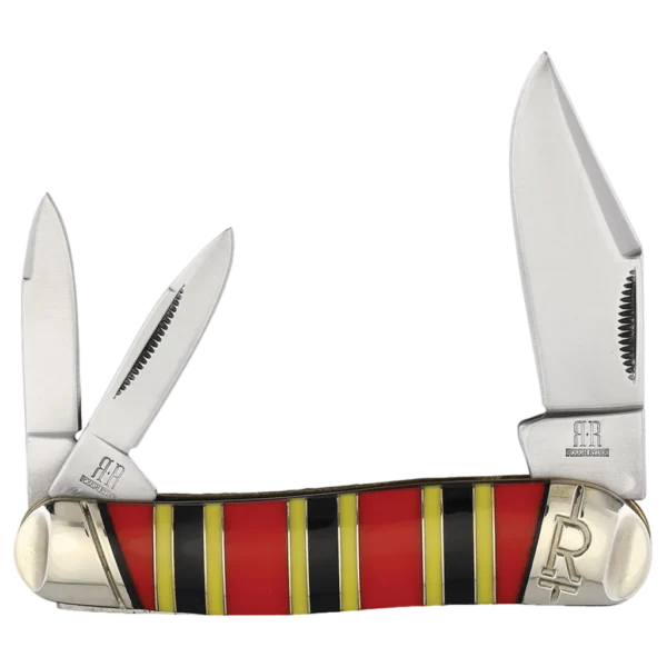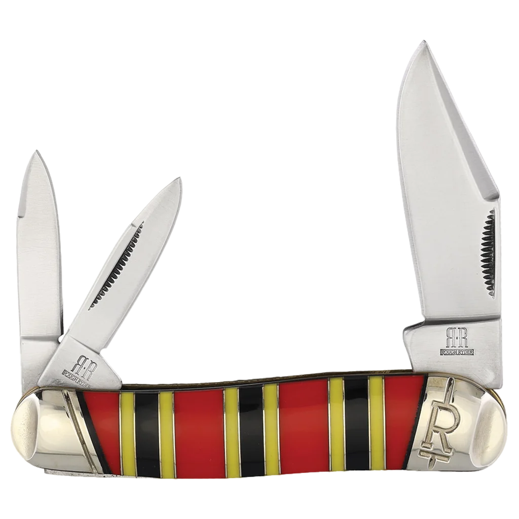 All the knives in the Rough Ryder Coral Snake Series feature mirror polished 440A stainless steel blades with match strike pulls. Made from red, black, and yellow coral snake synthetic material, the handle mimics the distinctive and vibrant pattern of the coral snake, making this knife a standout piece. The handle is further complemented by nickel silver spacers and bolsters, adding to its durability and elegance. The combination of these elements not only provides a visually appealing contrast but also ensures a comfortable and secure grip. This Rough Ryder Coral Snake Whittler features clip point and pen blades. It's 3.75" closed and weighs 1.5oz.