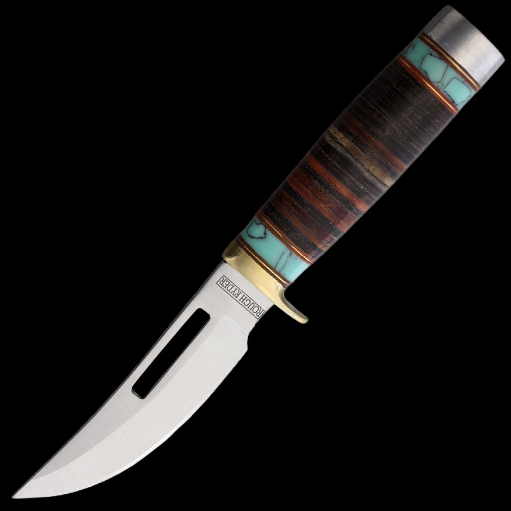 The Rough Ryder Cracked Synthetic Turquoise Skinner features a 4.5" stainless steel clip point blade with a satin finish, a cutout fuller, and a stacked leather handle. This full tang fixed blade has cracked turquoise, synthetic red, and brass spacers; a brass guard; and a stainless steel pommel. It's 9" overall and weighs 10.8oz. Includes a brown leather sheath with belt loop.