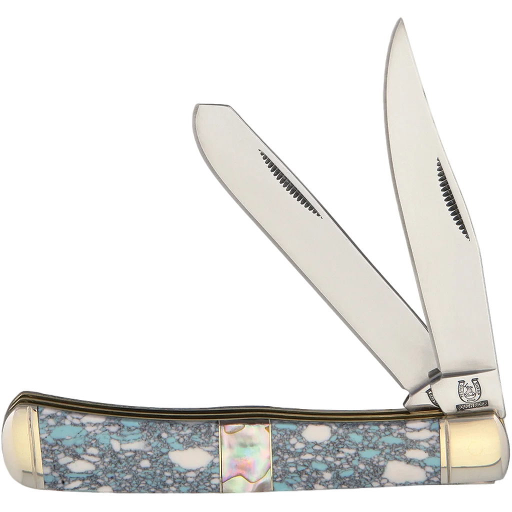 The Rough Ryder Crackle Stone Trapper has a synthetic stone mixed with abalone, which makes for a beautiful handle and durable 440A stainless steel clip and spey blades. It has a closed length of 4.12".