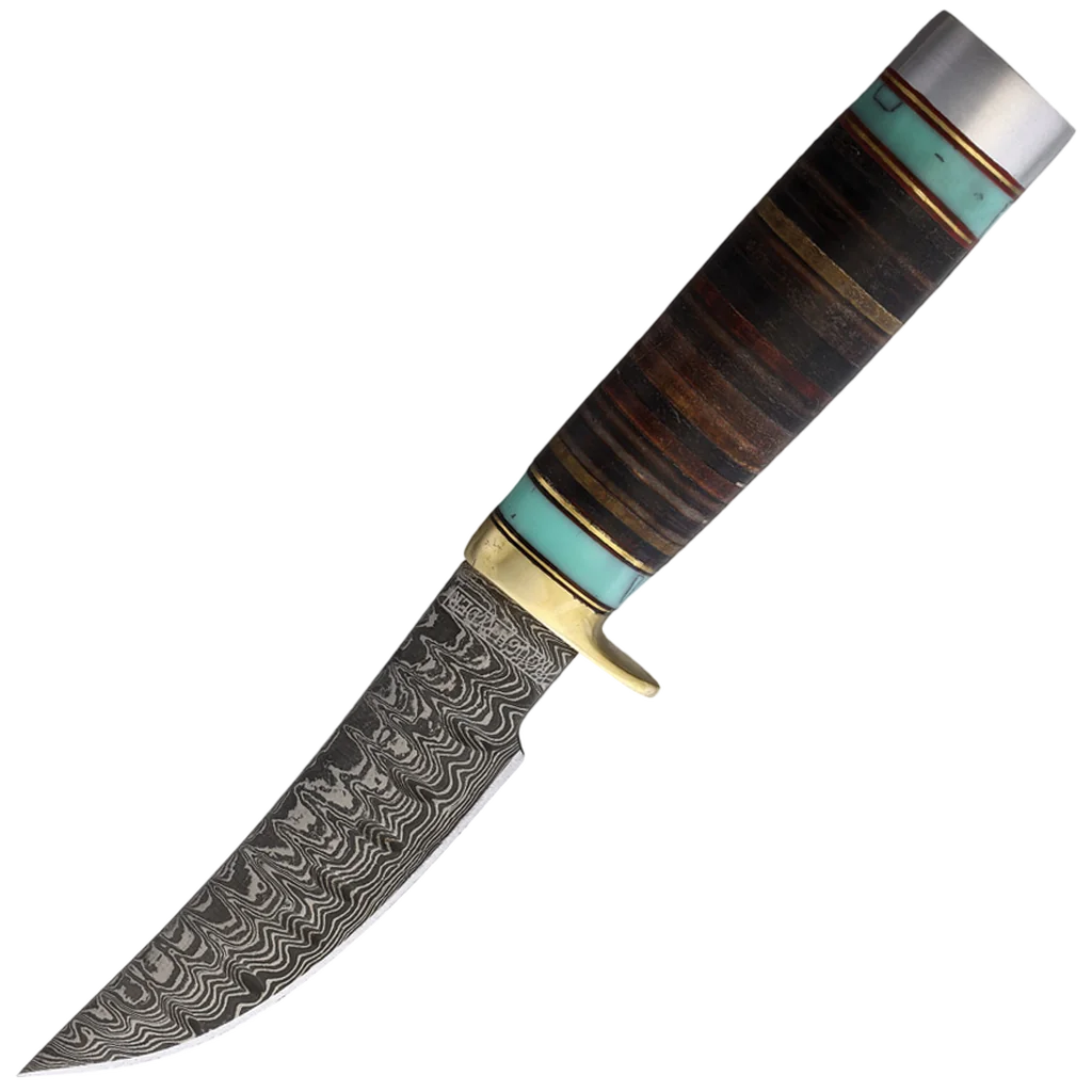 The Rough Ryder Damascus Skinner with Turquoise Inlay features a 5" damascus steel clip point blade with dark wood handles. This full tang fixed blade is .3" thick with turquoise inlay, brass guard, and a nickel silver pommel.