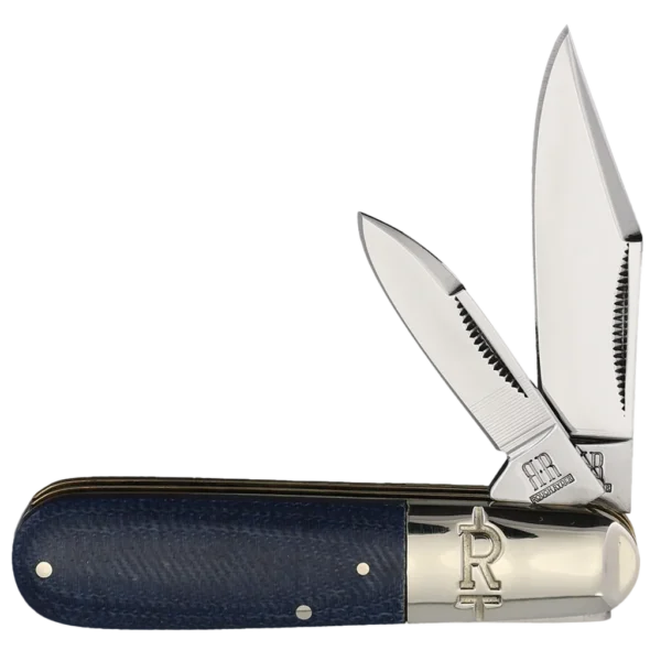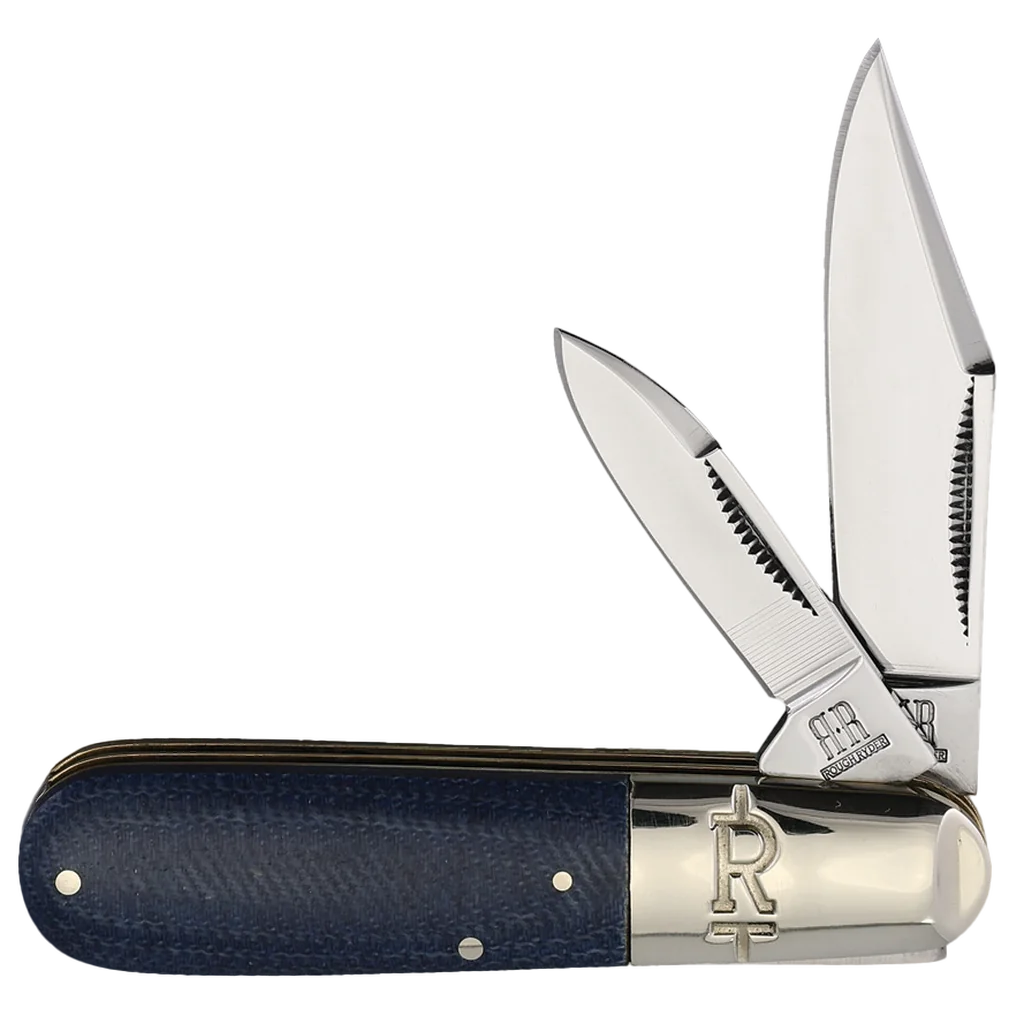 Discover the Rough Ryder Denim Micarta T10 Carbon Barlow, a pocket knife that combines rugged durability with classic design. Crafted with precision, this knife is a testament to Rough Ryder's commitment to quality and functionality. The knife features mirror-polished T10 carbon steel clip point and pen blades. Known for their strength and edge retention, these blades are built to tackle a variety of tasks with ease. The clip point blade is versatile, perfect for detailed work, while the pen blade offers additional utility for everyday needs. Both blades include half stops for added safety and nail nick pulls for easy opening. The handles are made from rugged Denim Micarta, providing a unique, textured grip that’s both comfortable and secure. Accenting the handles are nickel silver pins and the instantly recognizable Rough Ryder Slant R bolsters. At 3.25 inches closed and weighing just 2.9 ounces, this Barlow knife is compact and lightweight, making it an ideal everyday carry option.