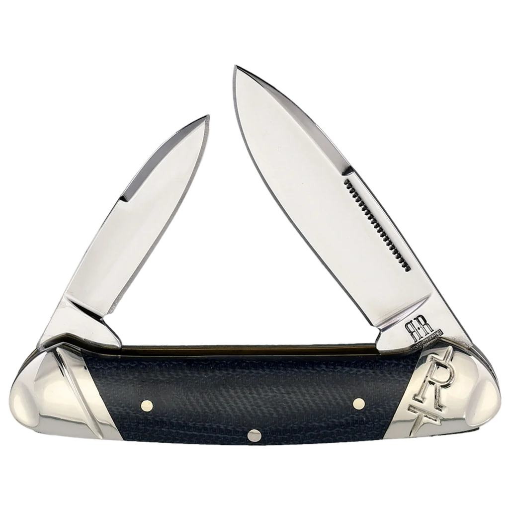 The Rough Ryder Denim Micarta T10 Carbon Canoe features mirror polished T-10 carbon steel spear point and pen blades with half stops and a match strike pull. The handles are denim Micarta with nickel silver pins and bolsters. It’s 3.62" closed and weighs 2.9oz.